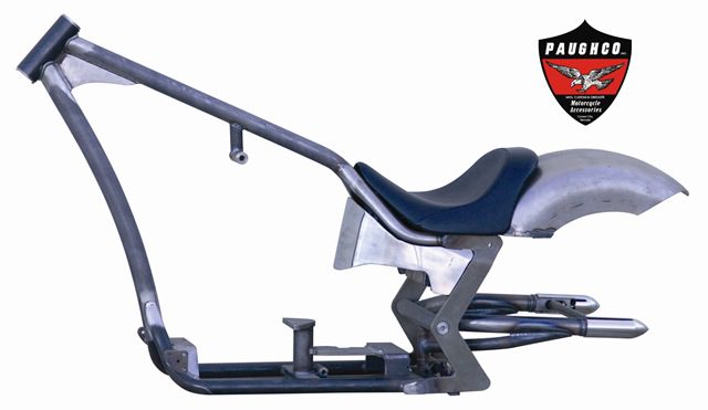 Check it out. Paughco has just released a sleek new frame that provides great lines and a perfect 23 ½” seat height. The new Right Side Drive frames accept 300 rear tires and feature a 1 ¾ backbone stretch, 2” diameter single front leg and 1 ¾” diameter tubular swing arm. Additionally the chassis comes with a 1” hidden axle assembly and integral forward control mounts. The Paughco 13 ½ fender, oil bag and solo seat in this photo are sold separately. Goin’ Pro-Street? Try the model with 5” stretch in the backbone and 38° neck rake. The chopper version, shown here, has 4” in the backbone, 7” in the front leg and 38° neck rake. For complete details call Paughco direct at 775-246-5738 or visit them on the Web at www.paughco.com