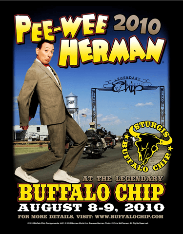 Legendary Buffalo Chip®, S.D. (May 25, 2010) – This past winter in Los Angeles, Pee-wee Herman came back to life with a stunning new production of "The Pee-wee Herman Show" that met with rave reviews by critics and fans of all ages. Now, Pee-wee and many of the original "Playhouse" gang are getting ready to hit "The Great White Way" this fall bringing the hit show to Broadway at The Stephen Sondheim Theatre for a ten week run beginning October 26, 2010. And, with new movies in the works and a brand new role in the SMURFS- it’s no wonder Pee-wee has decided to first have some fun in Sturgis at The Legendary Buffalo Chip®.