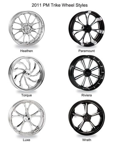 Performance Machine Trike Wheels are offered in the stock 15 x 5.5 replacement size, or if you want to see more wheel and not lose the stock ride, you have the option to upgrade to an 18 x 5.5. (15 x 7 for select manufacturers) For 2011, the Performance Machine trike wheel line includes the Paramount, Torque, Heathen, Luxe, Riviera and the Wrath. PM also offers a complete selection of matching components to create a complete PM trike package. Mark Finnie, president of Performance Machine stated, “PM products are pieces of art that help riders create a one-of-a kind ride. All PM products are designed to help riders create a cohesive, custom look with timeless beauty that lasts forever…That’s why world-class bike builders have been using PM products for years!”