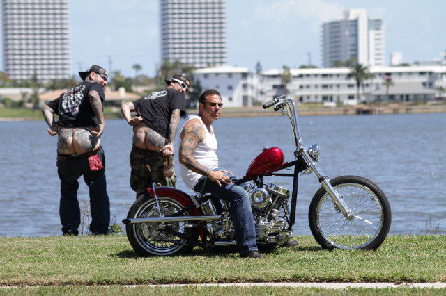 So I’m in Daytona and I ask the Wonder Twins to come on a photo shoot with me to get Sean’s Panhead for the magazine. As we set up to take the standard bad ass and his sled shot, these two sneak in from the side, slipping off their trousers, laughing like idiots……. It was all I could do to keep a straight face so Sean didn’t know what was going on. That’s some funny shit right there, but nothing compared to the stunt they pulled on Willy’s back 40 where he keeps his automatic wild life camera. Let’s just say that after we were home, the department of wildlife was on Willy’s property looking for a pair of Sasquach.