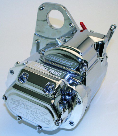 Over 4 years ago, Rivera Primo launched its new line of premium quality Left Side Drive & Right Side Drive Softail® style 6 speed transmissions, highlighted by an industry first 2 year unlimited mileage replacement guarantee. Our PowerDrive™ 6 transmissions have become a force to be reckoned with, in terms of reliability and smoothness. These transmissions all have in common features that make these boxes the best in the industry such as choice of finish (polished, chrome or black wrinkle), 32 tooth final drive pulley, close ratio 2.94:1 first gear; second gear 2.21; third gear 1.60, fourth gear 1.23; fifth gear 1.00, 0.860:1 overdrive sixth gear, & forged and back cut gears for positive shifting.