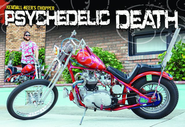 Having been in the scene for several years, Kendall loved the idea of working, designing, and building any parts the motorcycle may require. This would be his fi rst frame up build, so Keer was new to making certain things from scratch. He found it more a of a challenge since the frame was technically complete. Some of the unique items were the footrest, upper front headlight mount, and his friend Chris’s coffi n tail light that was handmade by welding aluminum in his shop. They also reworked the sissy bar which is an AEE found at a swap with really bad supports welded on that were twelve inches too short. Kendall felt it fi t the bike perfectly, adding to the graveyard scene painted on the rear fender. The lower exhaust mounts presented a problem since there were no spots available. Kendall used ‘P’ clamps and fabricated mounts that lined up with the lower motor mount to secure the exhaust. About two weeks before the Cheap Thrills show in NJ they were scrambling to fi nish when Kendall fi gured out the magneto hardware was the wrong size. A call out to Joe Hunt meant they were hooked up with the right parts and back on track to meet the newly imposed deadline! All the time spent with friends and others he met along the way to complete the build paid off as the chopper took the award for “Best British.” The bike turned out a little sweeter then Kendall was expecting, as he was not intending a show bike but quickly realized this was indeed a head turner. The motorcycle rides amazingly well, built to be ridden, and feels great which is all that mattered to him. Kendall hopes at some point to discover more history on the frame and particularly who painted it! Contact Cycle Source if you happen to have info!