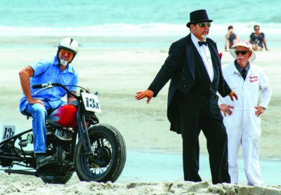 The host Oilers MC chose a vast array of pre-1948 motorcycles to race in two categories, ‘Big Twin’ and ’45-inch’ classes. There were over 80 participants and it was great seeing more servicars! The racing started around 11 am after the crowd settled in on the bleachers on the sand and the town gave the goahead as the tides receded. The fun started as racers found out that the town had removed three feet of sand to repair other stormtorn beaches. The downside of this; sand that was on the track would not be hard packed nor close enough to the ocean to help keep it packed. Mother Nature also decided during the day to present an hour of rain as well as a brief fog so thick that you could not see very far. Even wellexperienced racers had a new challenge in trying to get to the end of the track in a straight line. Newbies were easily bogging down as Sara jumped to wave the flag signaling the start. A vintage wrecker was utilized for hauling back those that could not get back on their own. R.J. Gibson was back with his photog moto to capture vintage tin images!