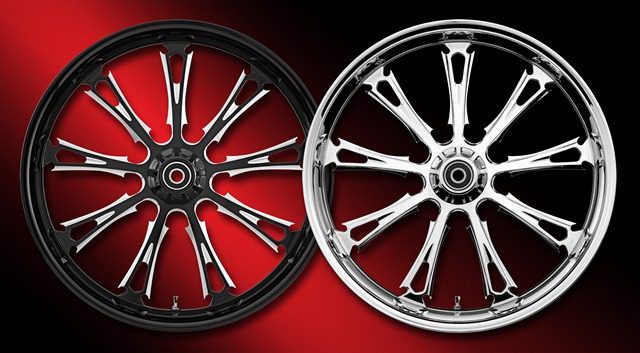 Renegade’s visionary R2 LOREDO shown here in both standard chrome and black Phantom Cut is a striking addition to their cutting edge R2 Series wheels. This 9-spoke gothic style wheel provides an imposing visual affect to any chopper or Bagger without the “gaudy” overkill. The slender spoke pattern provides a significant weight reduction and less rotating mass. R2 Series wheels are priced way below what you would expect with a retail price starting at just $899.00. Rims are available in diameters 16” to 26” and widths from 2.15” up to a massive 14”! Custom colors are also available on special request. For complete details call Renegade direct at 714-998-7241 and be sure to visit their awesome site at www.renegadewheels.com