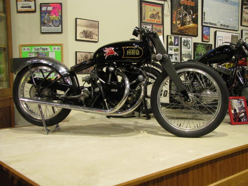 Many consider the image of Rollie Free in his bathing suit riding John Edgar’s HRD Vincent one of the most famous motorcycle photographs ever. The story of Rollie tearing off his leathers and deciding to improve his personal streamlining with a bathing suit, bathing cap and tennis shoes is stuff that not even Hollywood can dream up! Vincent enthusiasts will recognize that this is the bike that gave rise to the slogan “The World’s Fastest Standard Motorcycle” when it set a land speed record of 150.313 miles per hour. The machine does not get shown often, mostly at west coast concours. The owner has graciously agreed to loan it out for a display at the National Motorcycle Museum as part of the Museum’s current STREAMLINERS exhibition. |