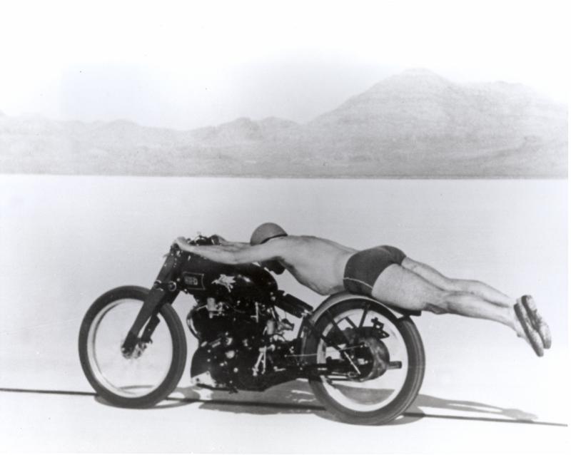 Many consider the image of Rollie Free in his bathing suit riding John Edgar’s HRD Vincent one of the most famous motorcycle photographs ever. The story of Rollie tearing off his leathers and deciding to improve his personal streamlining with a bathing suit, bathing cap and tennis shoes is stuff that not even Hollywood can dream up! Vincent enthusiasts will recognize that this is the bike that gave rise to the slogan “The World’s Fastest Standard Motorcycle” when it set a land speed record of 150.313 miles per hour. The machine does not get shown often, mostly at west coast concours. The owner has graciously agreed to loan it for a display at the National Motorcycle Museum as part of the Museum’s current STREAMLINERSpresented by J&P Cycles exhibition. |