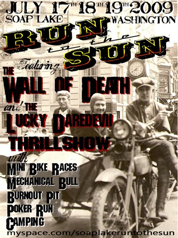 Once again, Soap Lake WA would like to welcome all motorcycle enthusiasts, motor heads and fun seekers alike to a three day, all out, no holds barred, motorcycle event featuring the much anticipated return of The Wall of Death where owner/builder J. Lightnin, Wahl E. Walker, Charlie Ransom and Sparky Lightnin race ride and drive racing go-karts, antique Harley Davidsons and vintage 1928 Indian 101 scouts on a vertical wall 14 feet above the floor.