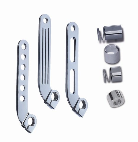 These trim and sleek inner shift arms from Softbrake are direct replacements for OEM inner arms found on 1982 to present FLH touring models. Shown here with optional spring loaded anti rattle spacers, shift rod spacer and shift rod cap, the arms are precision machined from 6061 billet aluminum. Each arm is designed with a splined, Allen bolt clamp for a secure fit, light weight and a super sanitary high tech look. Available in show chrome or black powder coat, the BAGGER INER LINKAGE ARMS can be ordered in slotted, grooved or with holes and retail for just $75.00. While you’re at it these cool arms are a perfect compliment for Softbrake billet shifters and shifter to transmission linkage components. Call direct to 714-680-0911 or head over to www.softbrake.com