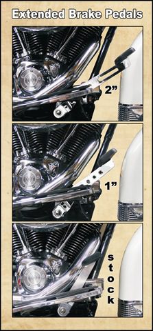 Softbrake recently introduced several new additions to their extended brake pedal line up. Designed specifically for 2008 – 2010 HD® Bagger models the new arms are 2” longer than stock. Users of both early and new versions have reported these application specific extended pedals provide superior braking control and pedal feedback for safer, more predictable stopping. Designed to be floorboard compatible with HD Baggers, the pedals are a quick bolt-on replacement part and accept factory rubber pads. All SoftBrake pedals are manufactured from premium quality American steel, and finished in durable show quality chrome or black powder coat. Three different pedal designs are available; plain, slotted, and circle-punched. SUPER-TECH PEDALS retail for just $149.95 and are available exclusively from North County Customs. Call 714-680-0911. On the Web www.softbrake.com. Dealer inquiries welcome.