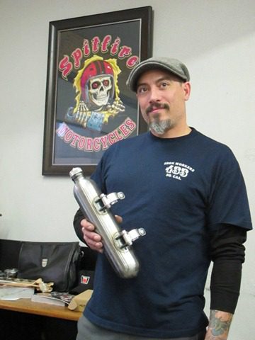 IMG_7696 We would like to thank Paul from Spitfire Motorcycles for donating one of his new Cherry Bomb fuel cell for the Chopper Show. This sweet little unit holds a half of gallon of US gas and has the clamps attached for frame or bar mounting. He also threw in some swag for you to grab. Sign up start @ 10am to 2 pm and the award show starts @ 4. See you there! IMG_7699