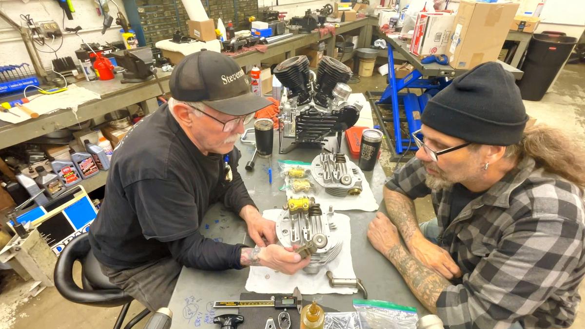 The shop runs in stages. Bikes arrive and queue in back, move to benches, then out the door. In between, there is Steve’s stash, or as he calls it, his collective. White cabinets hold decades of Harley parts. Projects include a 1961 Panhead with a molded frame he built long ago and bought back to redo, another Panhead, a Shovelhead, a Sportster, and a K-model engine he picked up in Pennsylvania. There is always another build waiting.
