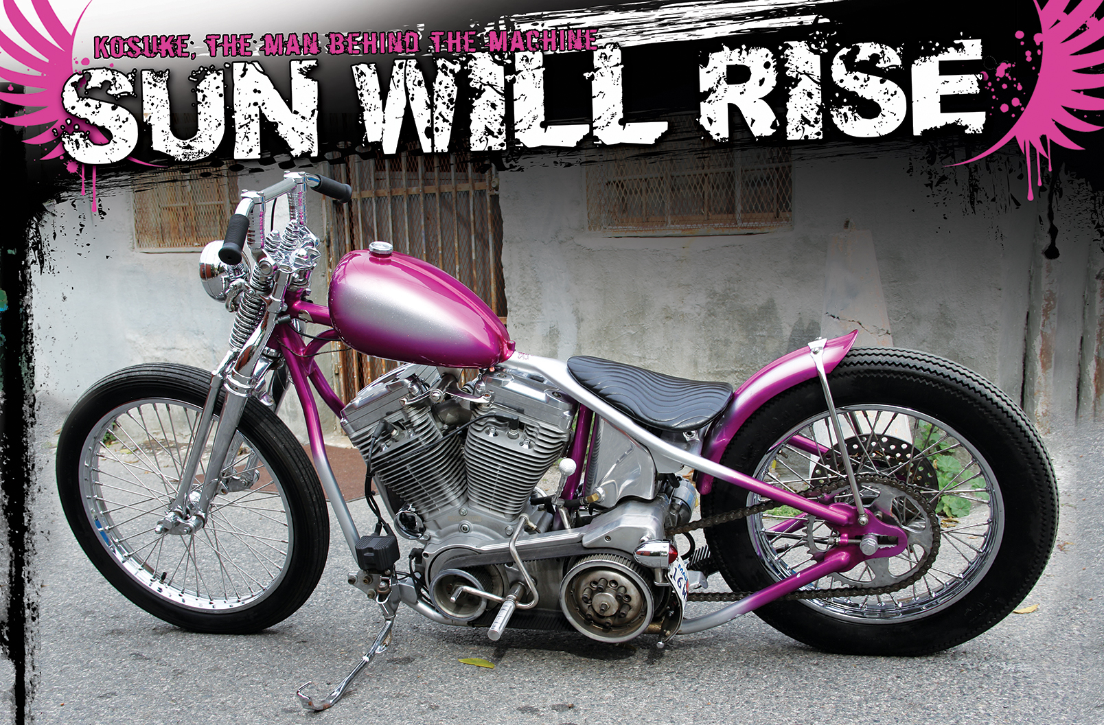 This bike is the kind you can’t help but notice in a sea of bolt-on billet barges; the Scott Craig paint virtually ensures that. The one-off parts and hand-picked swap meet treasures like the Wassell tank, old Chicago headlamp and ribbed fender of unknown origin, coupled with the newer HD Evo powerplant help to make this bike get down the road just fine, and it looks real nice doing it, too! Enter Sunrise Cycle. Kosuke, the man behind this machine, has become a staple at California’s numerous swap meets. You’ll usually see him with Scott Craig or more likely Johnny Surprise, previously Johnny Cocaine, (don’t ask). If you know any of these guys, y o u a l r e a d y know how a bike like this came to be. Ol’ bike mags from back in the day, late nights at the shop, maybe some twelvers and lots and lots of elbow grease get this bike’s lines to flow just right, son. Correct me if you don’t agree. Kosuke emigrated from Nagoya City, Japan almost 7 years ago with his wife and first born child. For a few years prior to the move, Kosuke was building righteous scoots in his home country. With the recent arrival of his second child, his drive to succeed as a professional bike builder is even stronger and more pronounced, as evident in the form of the bike you see here today.