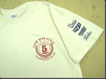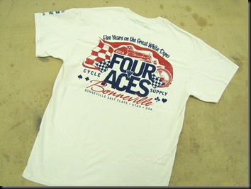The Four Aces Bonneville 2010 support t-shirt is available in sizes Small through 3XL at $18 each. All proceeds go direct to support vintage motorcycle racing. Secure ordering and world-wide shipping is available 24/7 from www.lowbrowcustoms.com. ![]()