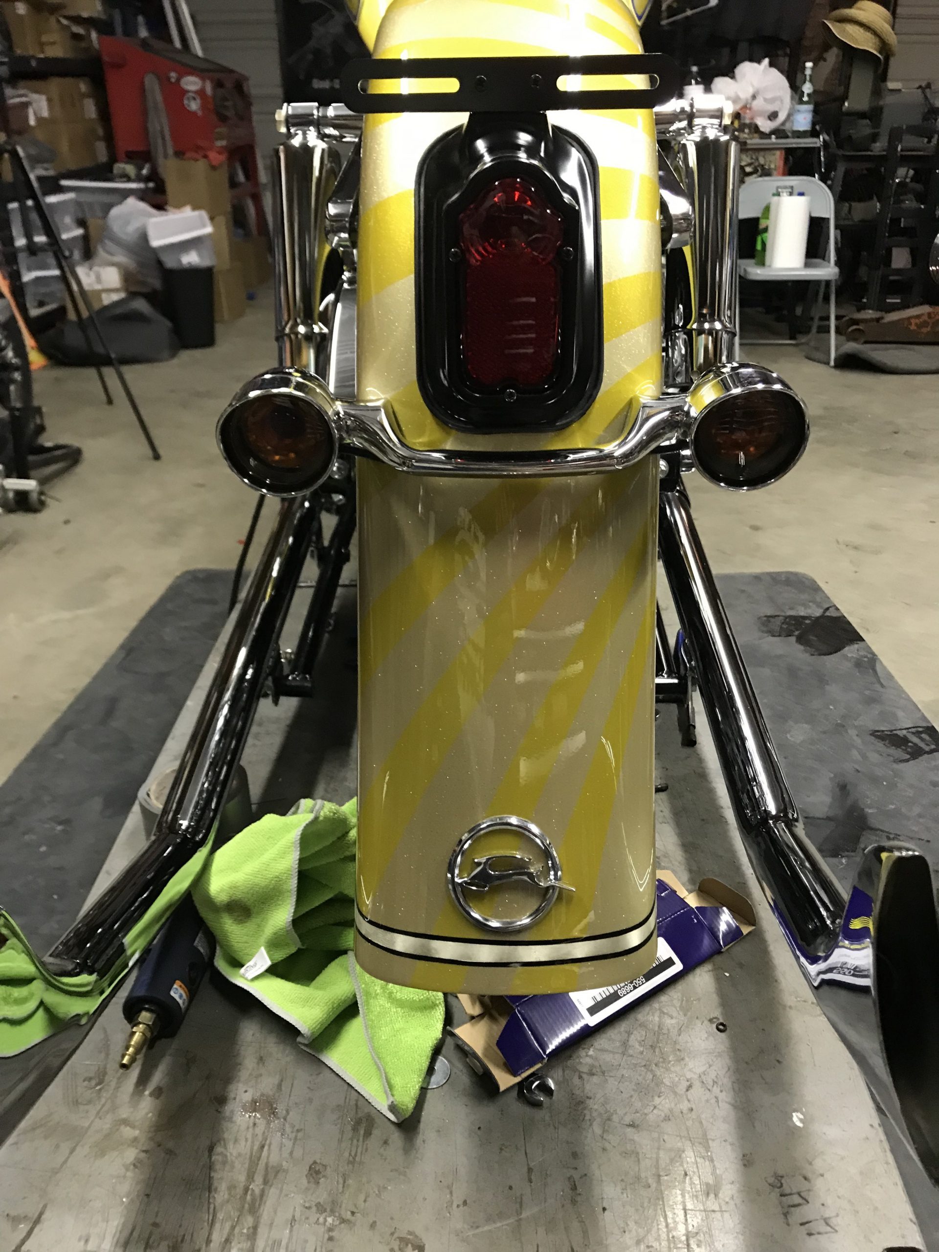 Second is to mount your fender as it will be on the finished motorcycle. In my case, we used a Klock Werks Benchmark fender that was a perfect fit for this 1991 Softail donor bike.