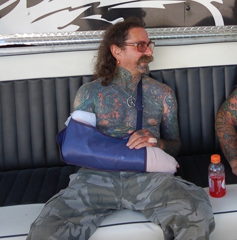 For anyone that doesn’t know, our brother Duke went down during the Big Mountain Run and broke some bones in his hand. The problem here is that it’s the hand he holds his tattoo machine in so he’s gonna’ be out of work for a while. If you can pass along a five dollar bill, or whatever you can, we’d much appreciate it. Duke’s a good shit and God knows he can’t rest on what we pay him! There is a Paypal account set up for him on our main page. Thanks-C