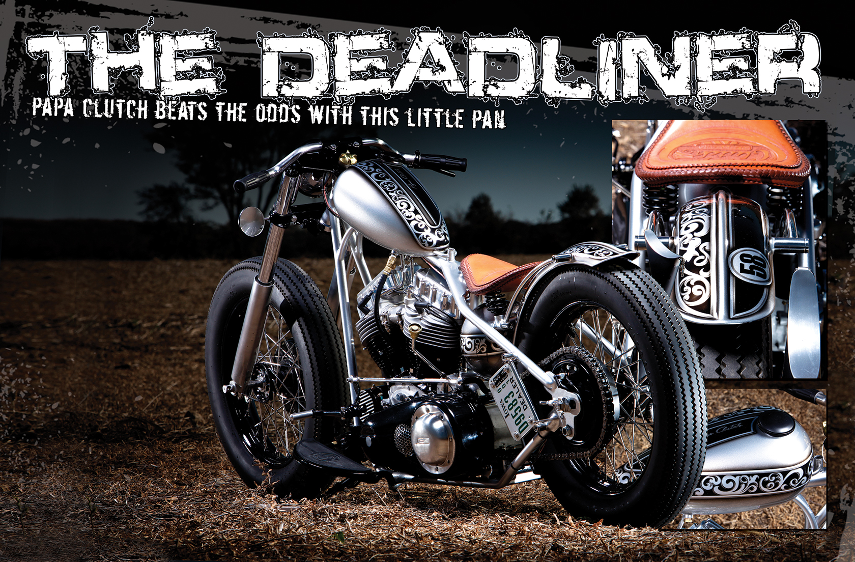 Daytona marked a change in the way the cats at Papa Clutch were doing business. They had been primarily a Sucker Punch Sallys’ dealer from Iowa but when they rolled bikes out of the back of their little Scooby Doo van at Bike Week, you could see that there were a lot of changes going on. They had a bitchin’ Shovel and a coolass little Pan that were both new additions to the family since the last time we had seen them. Little did we know at that time that they had this sweet ride lurking in the background. It started with an obsession of sorts; the best way I firmly believe to build a bike. For two years, the Pan motor sat on top of the bench in their shop and waited to find the right home. Tim Anding, Papa Clutch himself, wasn’t in a hurry to build the bike and had the idea that whatever it turned into, he wanted to make sure the motor was the star of the production. They found an old ’69 Adjust-A-Glide frontend with the brake on the right and matched that to a hardtail frame, and just like that it was a roller. It sat for another year in that condition before the heat would get turned up on Tim to finish it.