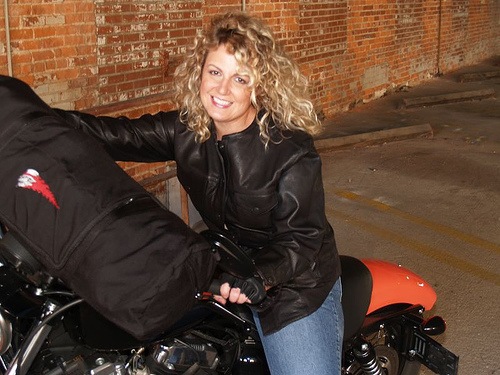 Note: Cherry Blair is photographed on her Nightster with a Race Shirt, Torian Nose Pickers gloves, and Bandit’s Bed Roll bag from Bikernet.