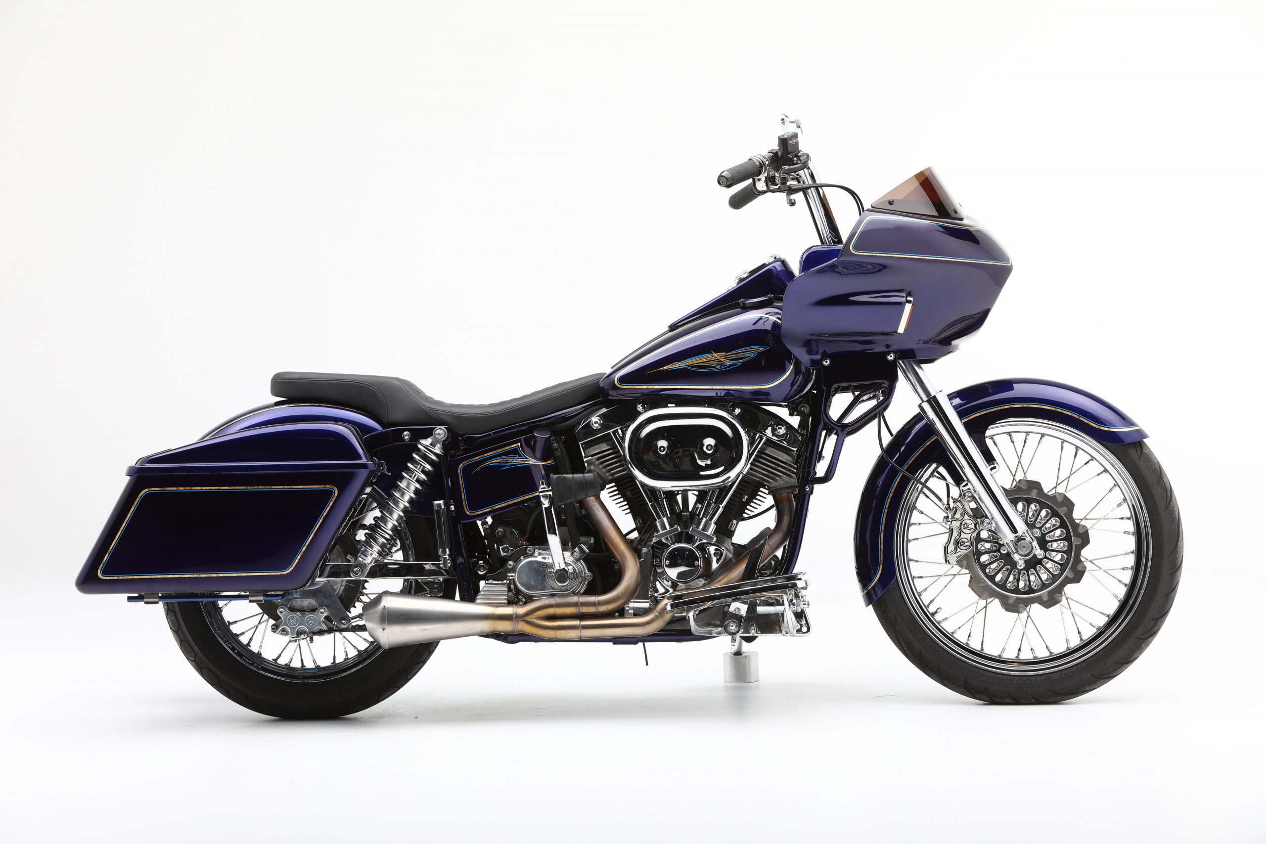 Dave has never been one for concept drawings and long drawn out formalities. He has the talent and ability to see the entire build in his head from beginning to end. He knows where to start and where to go and that is the kind of builder you want in your corner. Once he had the boxes in his possession the motor was sent to Buffalo New York to his engine magician Dan Thayer. When the Perewitz team is hellbent on shattering records on their land speed bike, Dan is the man that finds every last available shred of power, and for this build, he was the only one Dave could trust to resurrect the 88ci shovelhead. Soon after Dan returned life to the Shovel, both motor and transmission were returned to the stock FX frame. A late model FL dual disc front end with Legends inserts was mounted up front along with a 21 inch spoke wheel. The twelve-inch ape hangers give the rider something to hang on to tucked behind Bill Blackmore’s wedge fairing; there is a road glide styled shield only roughly twenty percent smaller with a custom dash made in house. Perewitz decided that the fuel would be stored within the confines of Softail flatside tanks keeping with a custom touch masked in mostly Harley parts