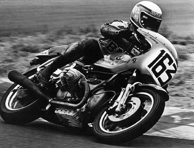 Pridmore aboard his Butler & Smith BMW R90S at Laguna Seca Raceway in 1976, his first AMA Superbike National victory.