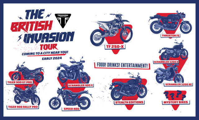 To celebrate the large wave of new model motorcycles, Triumph is hosting 20 “British Invasion Tour” events across the United States in January and February, where each of the new models will be showcased. At every event, Triumph enthusiasts will gather for an exclusive one night only first look at the new for ’24 models which are not yet in dealerships, while also enjoying live entertainment, a variety of activations, and some light food and beverages.