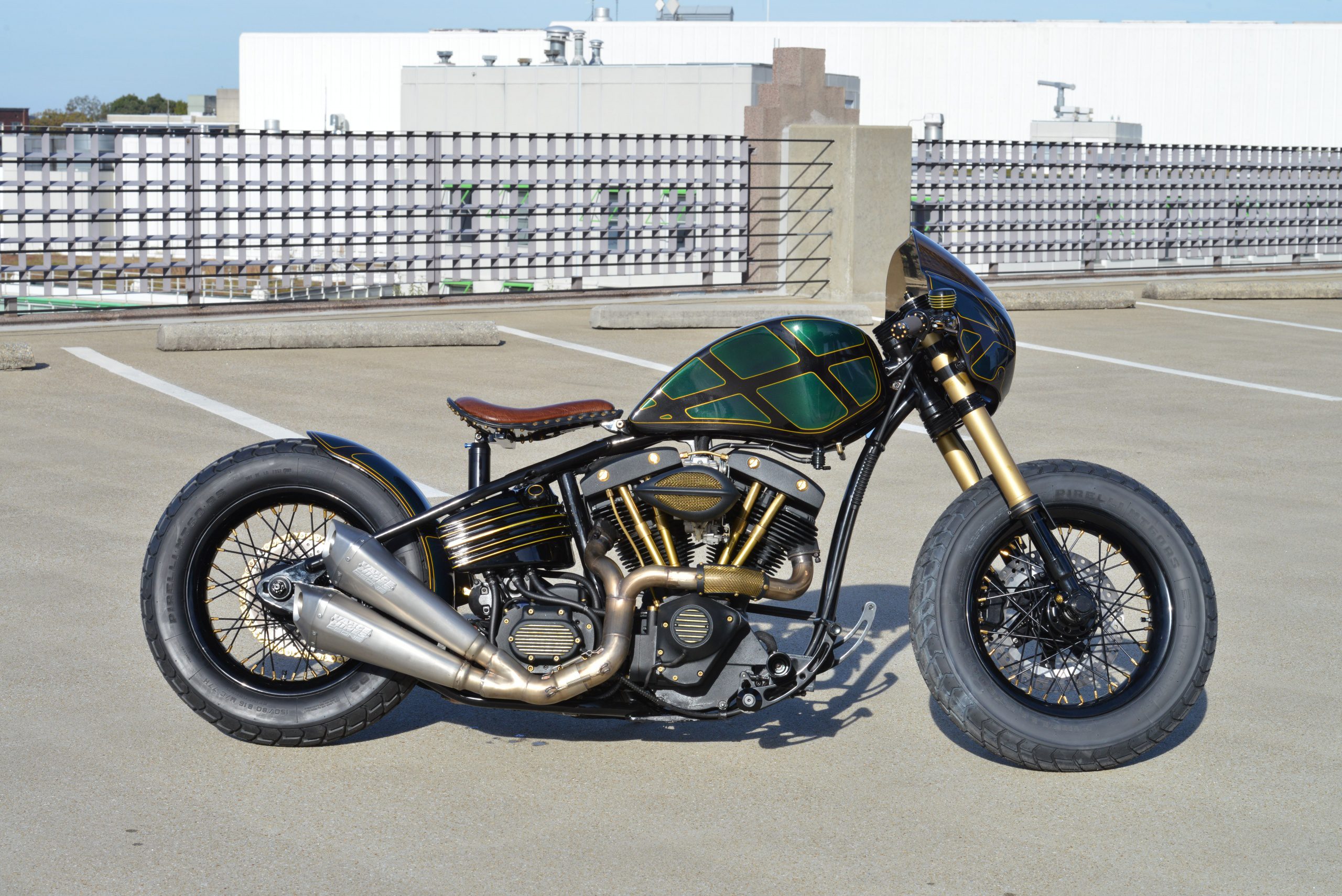 As you can imagine with a project that spans six years, every piece of the bike comes with its own history. Porter always had an attraction to Shovelheads. While visiting St. Louis, a Craigslist ad sent him to a shady part of town in search of the heart for his project. He found himself standing in a shop with rows upon rows of Panheads, Shovels, and Evos. The proprietor of the shop in question told him to choose his poison, and they would settle up after. After some searching he found a motor with decent compression and all its fins, an excellent start to a long trek. The plan was to dress the engine in black powder and to do that Tyler reached out to Andrew at Revolution Performance. While ironing out the details, Andrew inquired about who was going to be building the motor and offered his services. Jumping at the opportunity to have skilled hands revitalizing the Shovel, the motor was shipped out for some much-needed attention. Andrew went through the heart undoing all the previous wrongs, re-ported the heads and balanced the crank producing a Shovel that runs better than ever imagined. To add performance, Tyler installed a Keihin FCR carb off a KTM 640. The combination of the carb with electronic ignition and finely tuned motor Porter says the response is equal to a fuel injected motor, which for a Shovel is a rarity.