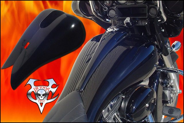 Now here’s a smokin’ hot item that is going to save shops and privateers big time and big money while achieving that sleek stretched appearance popular with today’s Bagger and custom enthusiasts. The slick, flawlessly formed fiberglass tank covers fit quickly and simply over the stock tanks using an automotive panel bonding epoxy. In most cases the stock tanks don’t even need to be removed. Vicious tank cover halves are manufactured extra long so they can be trimmed to follow the seat lines with or without a traditional gap. Additionally they drop down low enough to compliment the side covers. Tank covers are sold in pairs finished in gel coat black. Simply, trim, paint, install and you have a what appears to be a set of awesome stretched tanks at a fraction of the cost and hassle involved with cutting and welding your stockers. Suggested retail for the unique Vicious tank covers is just $295.00. For complete details call Vicious Cycle direct at 805-466-3500 or catch them on line at www.vicious-cycle.com