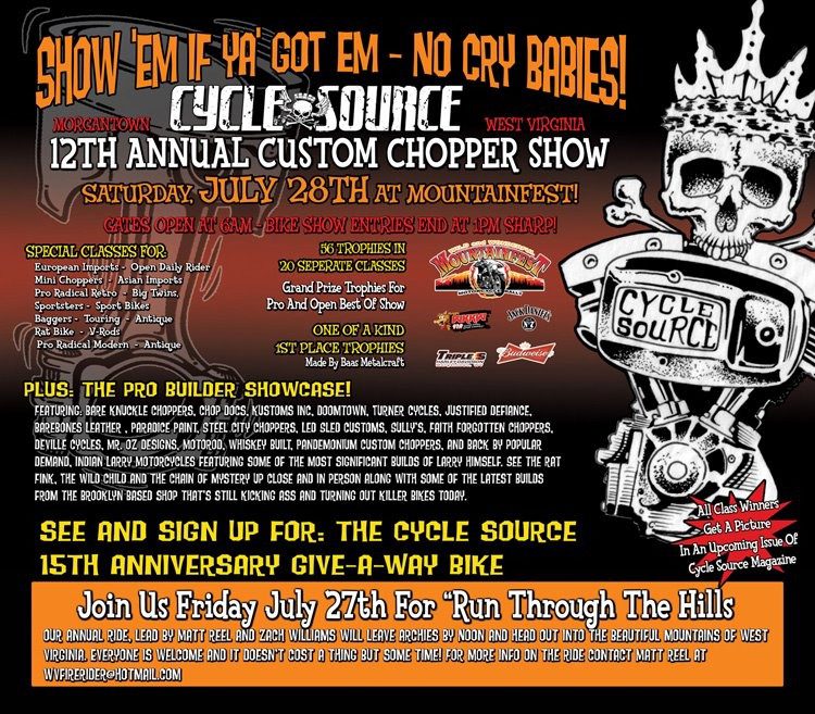 The Annual Cycle Source “Run Through The Hills” on Friday July 27th starts at Noon from Archie’s and takes riders through some of the most scenic roadways in West Virginia. For more info on the ride contact Matt Reel at wvfirerider@hotmail.com