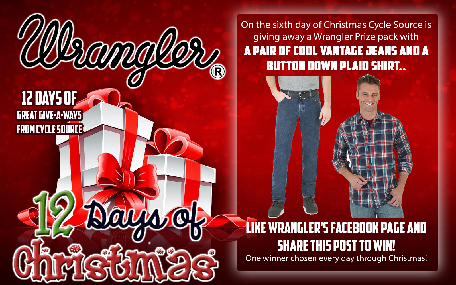 On the sixth day of Christmas Cycle Source is giving away a Wrangler Prize pack with a pair of Cool Vantage Jeans and a button down plaid shirt. Like Wrangler’s Facebook page and share this post to win! One winner chosen every day through Christmas!![]()