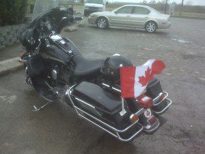 Having just returned from a quick trip to Canada with Buzzy, on his way to West Africa, I had a startling revelation. I noticed in Canada how proud they are of their country. Every home, office and car proudly displays the maple leaf flag of their country. So taken by this was I that I bought one and put it on my bike for the ride home where I expected to buy an American flag for the other side of the bike. Once I crossed the border however, I was surprised to find that I couldn’t buy an American flag like this…. Anywhere.Oh there were places that sold little stickers, pins, magnets and I even found a few department stores that had a small offering of standard size flags for your yard but many, including big box stores, didn’t have any at all. I checked truck stops along the way, exited the expressway to go into towns to look in little and big stores alike but I could not buy this same flag at any of them. When I asked people why that was the answer usually given was that it is still to far away from 4th of July. BULLSHIT!!!!!