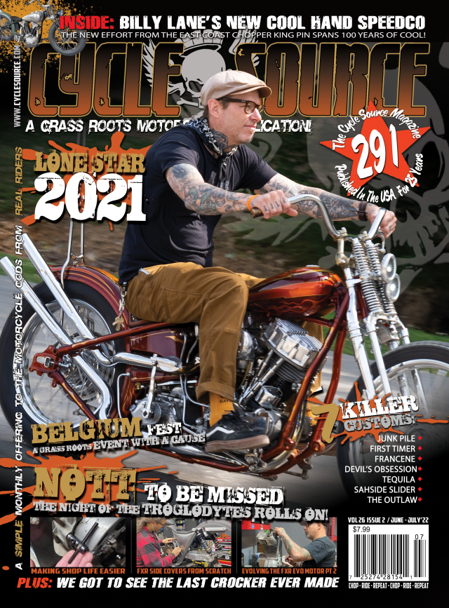 Issue 291 is loaded with killer stuff! Breaking news on Billy Lane’s latest project, Cool Hand Speedco, a recap of BelgiumFest, a grassroots event with a cause, Josh didn’t let COVID stop him from hitting NOTT and we take a peak at the Last Crocker ever made! Seven Killer features fill the pages and the beautiful “Francene” built by Alleway Kustoms graces the cover. Pandemonium Custom Choppers shows us a few tips and tricks to make shop life easier, Chris shares his technique for handforming FXR side covers and Jason freshens up the FXR Evolution powerplant. Chopper Charlies started his European adventure, and Road Chip meets the nicest people on a Harley. We get to know Ronnie Melendez from Weights & Paints and Poppy Broyles shares why he thinks the SmokeOut is so important!